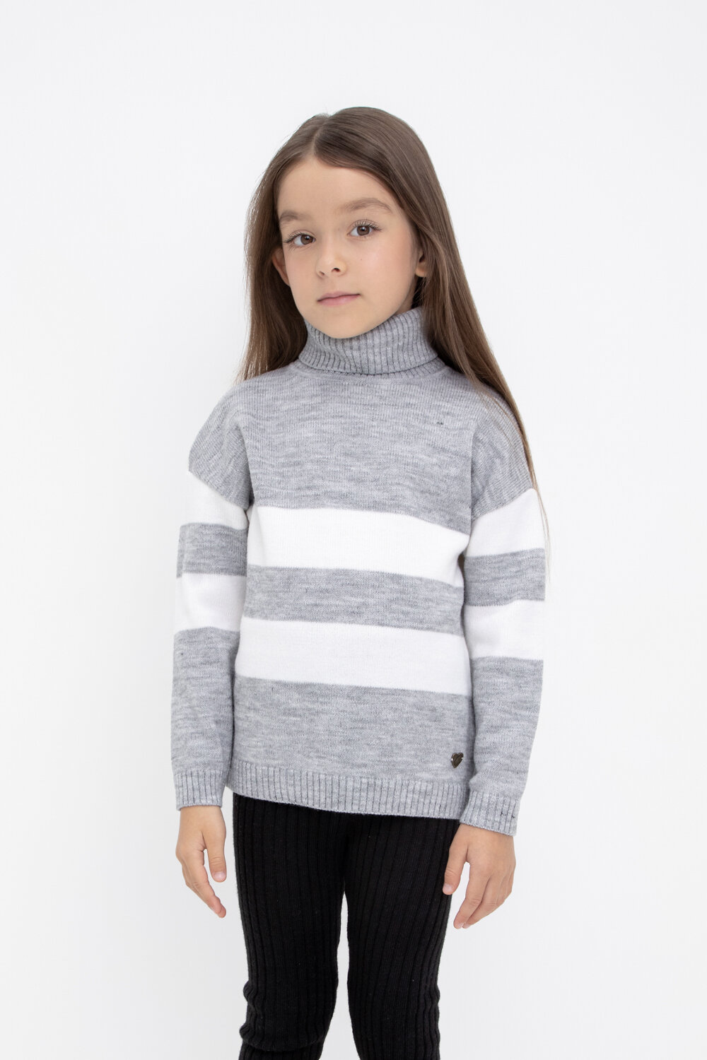 Вязаный джемпер для девочки из мягкой полушерстяной пряжи. Высокий воротник с отворотом хорошо защищает от холода. Длинные рукава с манжетами. Внизу эластичный пояс. Изделие сохраняет форму и стойкий цвет после многочисленных стирок.