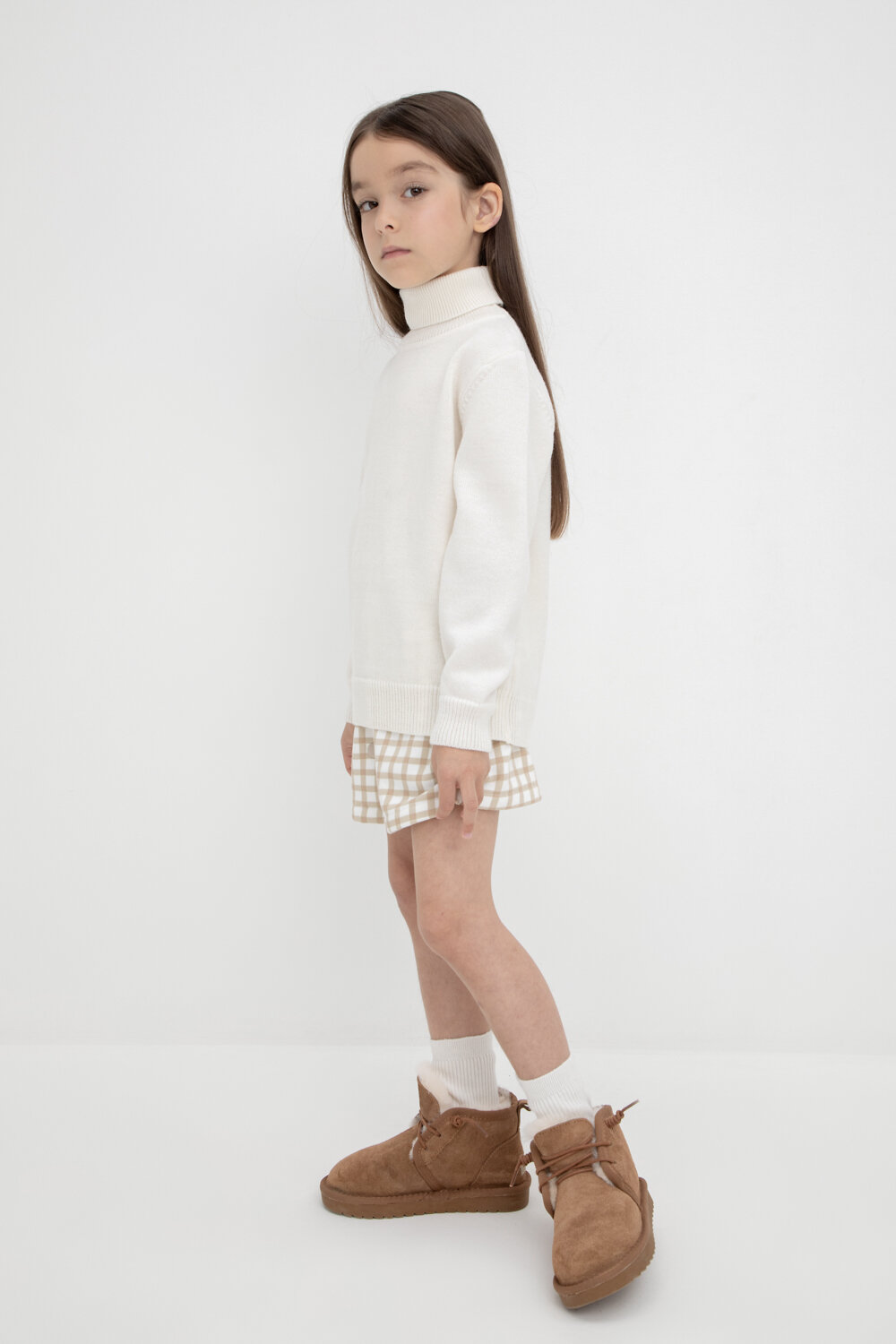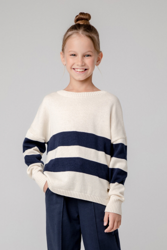 Вязаный джемпер для девочки из мягкой полушерстяной пряжи. Высокий воротник с отворотом хорошо защищает от холода. Изделие сохраняет форму и стойкий цвет после многочисленных стирок.