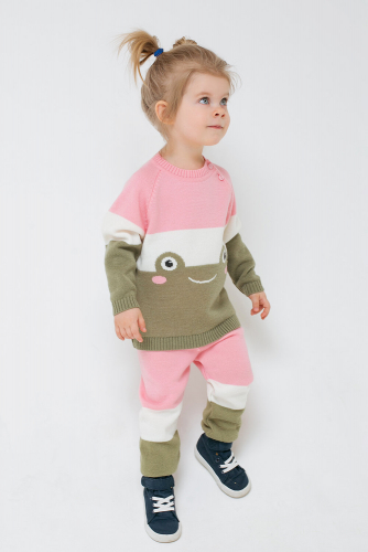 Вязаный комплект из полушерсти: джемпер с круглой горловиной и брюки. Украшен вывязанным узором с изображением мордочки лягушонка и широкими полосами. Джемпер застёгивается на пуговицы спереди на плече. Горловина, манжеты и пояс связаны ластиком. Ширина брюк регулируется с помощью вязаной ленточки.