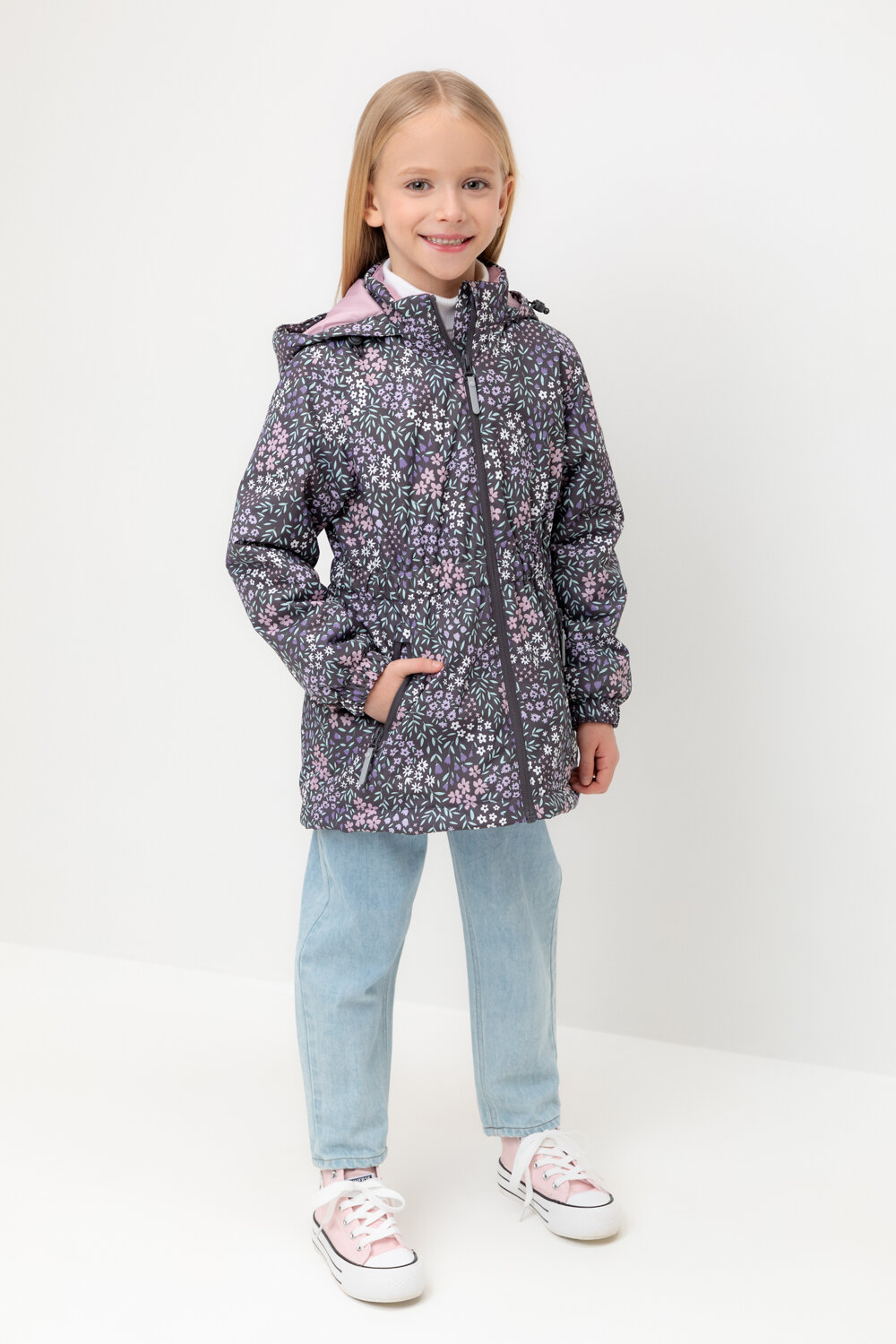 Демисезонная куртка для девочки с утеплителем SEE 120 г/м2. Выполнена из мембранной ткани с дополнительной тефлоновой обработкой. Данный вид обработки предохраняет изделие от загрязнения и лучше отводит влагу. Подклад из 100% полиэстра. У изделия предусмотрена защита подбородка. Несъемный капюшон регулируется с помощью эластичного шнура со стопперами. Низ рукавов изделия имеет эластичную резинку для лучшего прилегания. На талии эластичная резинка. Спереди два кармана на замках. Во всех изделиях верхнего ассортимента для безопасности ребенка предусмотрены светоотражающие элементы.