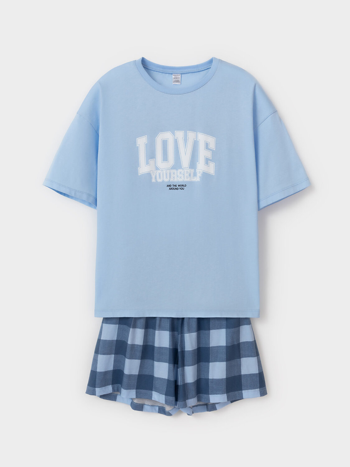 Трикотажная пижама из натурального хлопка для комфортного сна и отдыха. Футболка с короткими спущенными рукавами и шорты с мягкой эластичной резинкой в поясе. Оригинальная набивка и принт выполнены из стойких текстильных гипоаллергенных красителей. Изделие сохраняет цвет и форму после многократных стирок. Все трикотажные полотна производятся в соответствии с нормами швейцарского сертификата ЭкоТекс.