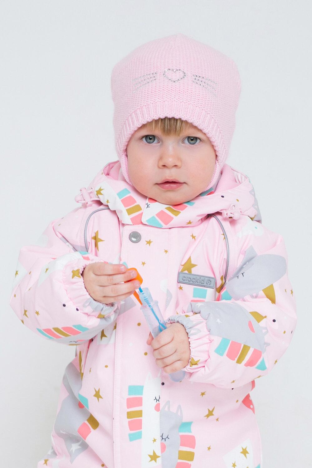 Розовая шапка из полушерсти на завязках. Внутри - мягкая подкладка из трикотажа интерлок. Украшена вязаными заячьими ушками на макушке и стразами.