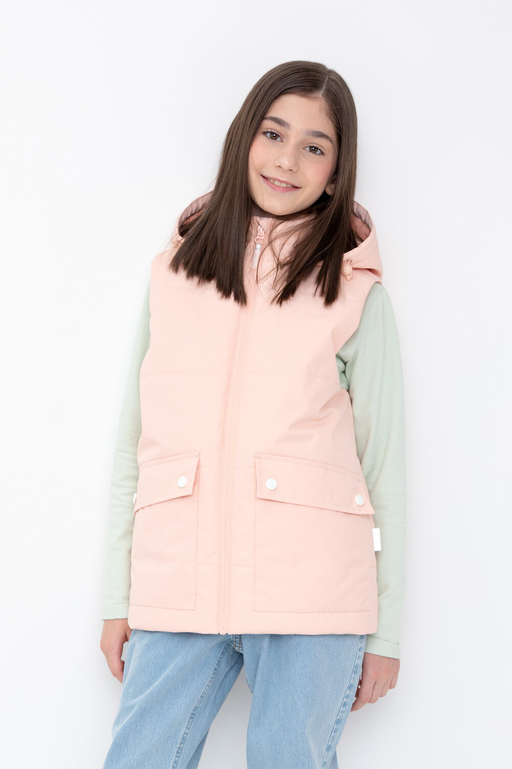 Стеганный жилет с капюшоном для девочки с утеплителем Fellex®: 120 г/м2. Выполнен из мембранной ткани с дополнительной тефлоновой обработкой и матовым покрытием. Данный вид обработки предохраняет изделие от загрязнения и лучше отводит влагу. Подклад из 100% полиэстра. У изделия предусмотрена защита подбородка. Накладные карманы с клапанами на кнопках. Во всех изделиях верхнего ассортимента для безопасности ребенка предусмотрены светоотражающие элементы.