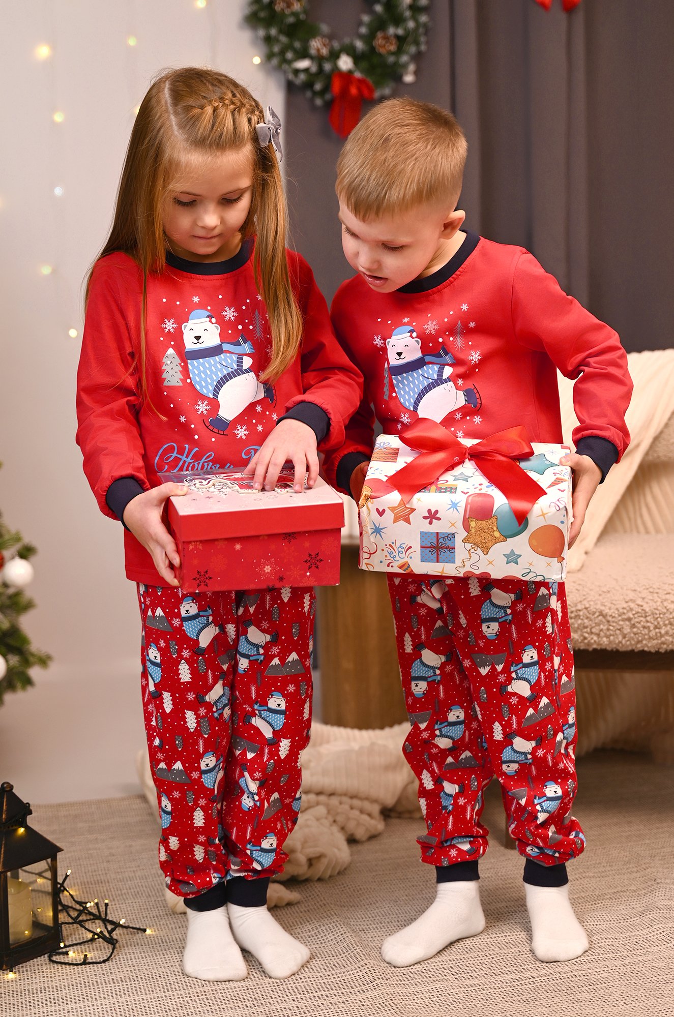Яркая новогодняя пижама с брюками для мальчика и для девочки создаст атмосферу праздника и уюта. Весёлый принт Медведь с надписью подарит радость и ожидание волшебства каждому ребенку. Детская пижама станет отличным подарком для детей и подростков на Новый год и Рождество.