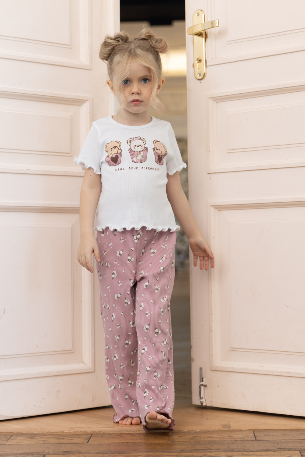 Пижама Флаффи создана из мягкого хлопкового трикотажа: белая футболка с принтом мишек и розовые брюки в мелкий цветочек. Материал приятен к телу и не раздражает кожу. Свободный крой и эластичный пояс обеспечивают комфорт и уют во сне. Цвет: ; Материал: интерлок;интерлок; Состав: 100% хлопок.
