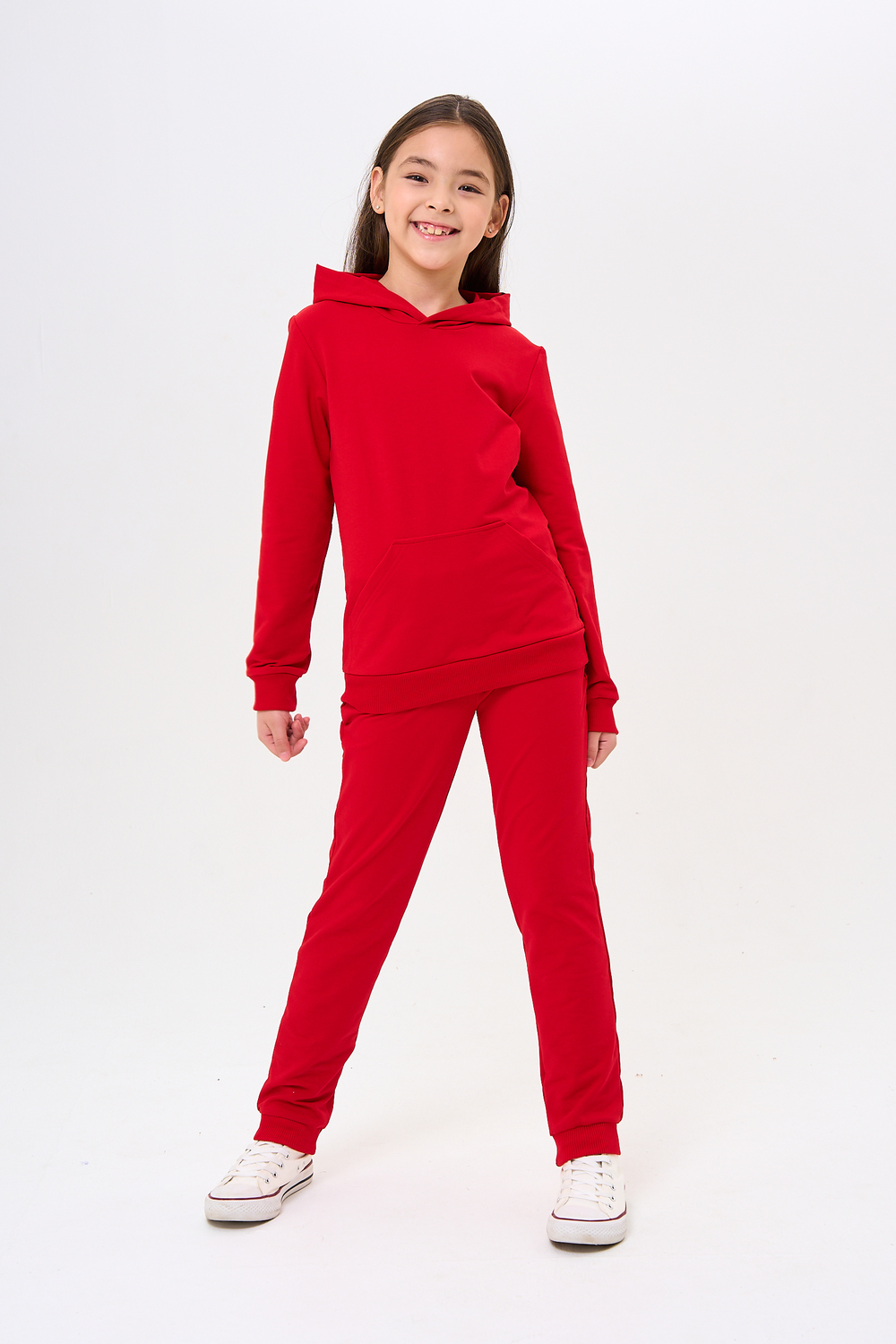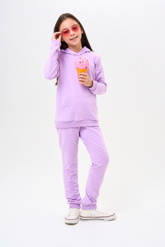 Костюм для девочек дошкольного и младшего школьного возраста. Костюм состоит из толстовки и штанов. Костюм из трикотажного эластичного хлопкового однотонного полотна футер. Толстовка с капюшоном, с длинным рукавом на манжете и поясе из основного полотна. На переде толстовки расположен карман-кенгуру. Штаны с боковыми карманами, на манжетах и поясе из основного полотна.