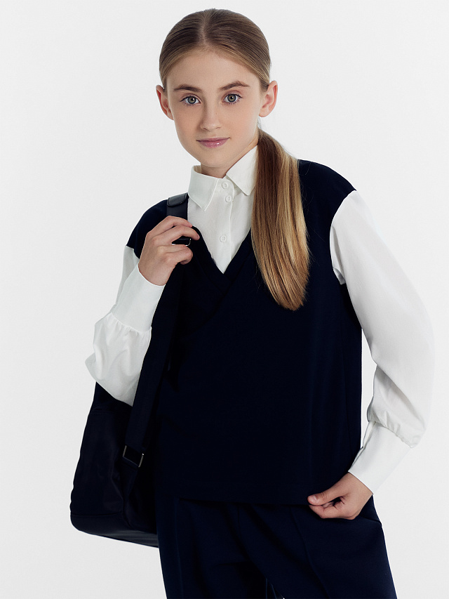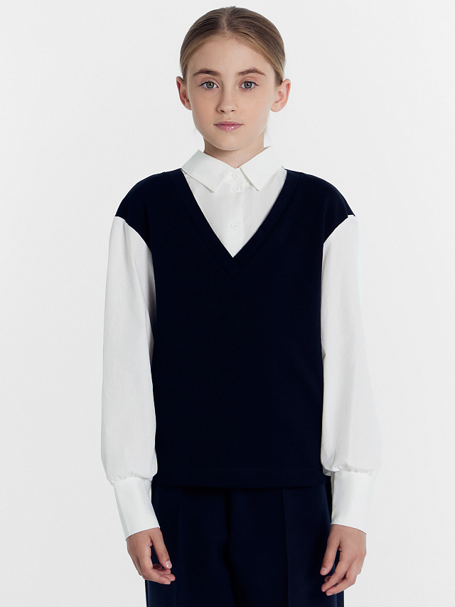 Школьный джемпер-обманка для девочки представляет собой модель свободного силуэта, которая сочетает в себе имитацию жилетки и рубашки. Этот дизайн придает джемперу особый шарм и делает его стильным и оригинальным. Жилет изготовлен из качественного селаника и имеет V-образную горловину. Рубашка, в свою очередь, выполнена из прочной ткани и имеет круглую форму горловины, а воротник украшен стойкой. По переду рубашки расположена центральная застежка на пуговицы, благодаря чему джемпер легко надевается и снимается. Спущенное плечо и углубленная пройма дарят свободу движений. Втачные рукава - длинные, выполнены из той же ткани, что и рубашка. Низ рукава немного расширен и присборен, а по низу - отрезная манжета из ткани, которая создает аккуратный вид. Отличный выбор для создания школьного образа, который сочетает в себе комфорт и стиль. Рекомендуем!