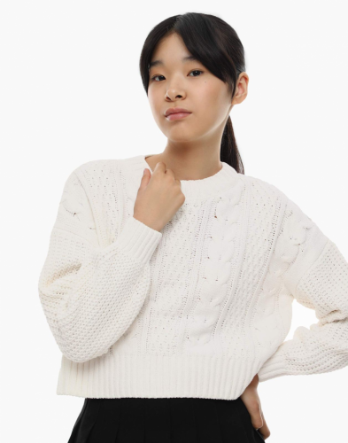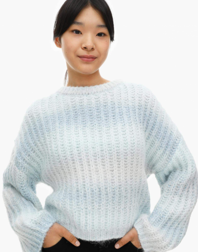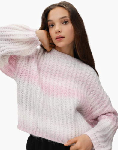 Джемпер с градиентным принтом выполнен объёмной..показать вязкой из мягкой пряжи. Благодаря фасону oversize модель сидит свободно. Вырез-лодочка, заниженная линия плеча. вязкой из мягкой пряжи. Благодаря фасону oversize модель сидит свободно. Вырез-лодочка, заниженная линия плеча. 100% полиэстер