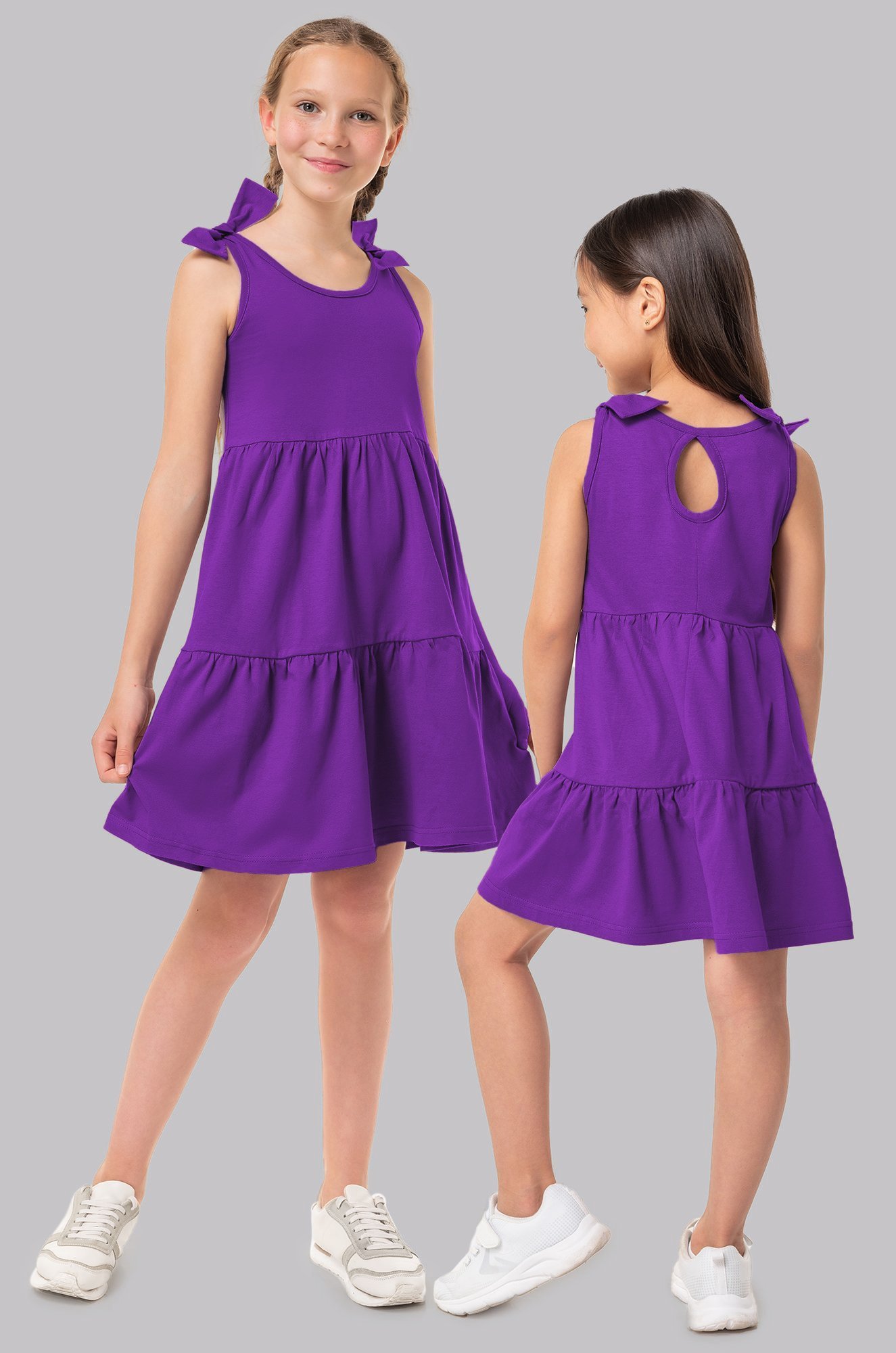 Однотонный фиолетовый сарафан из трикотажа подойдет для поездок, путешествий и активного отдыха. Подростковое платье идеально для повседневных прогулок.