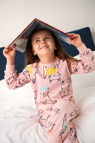 Теплая пижама с брюками для девочек выполнена из 100% хлопка. Футер с начесом делает её особенно мягкой и теплой. Спокойный молочный цвет и веселый принт с котиками создают уютную атмосферу и поднимают настроение.
