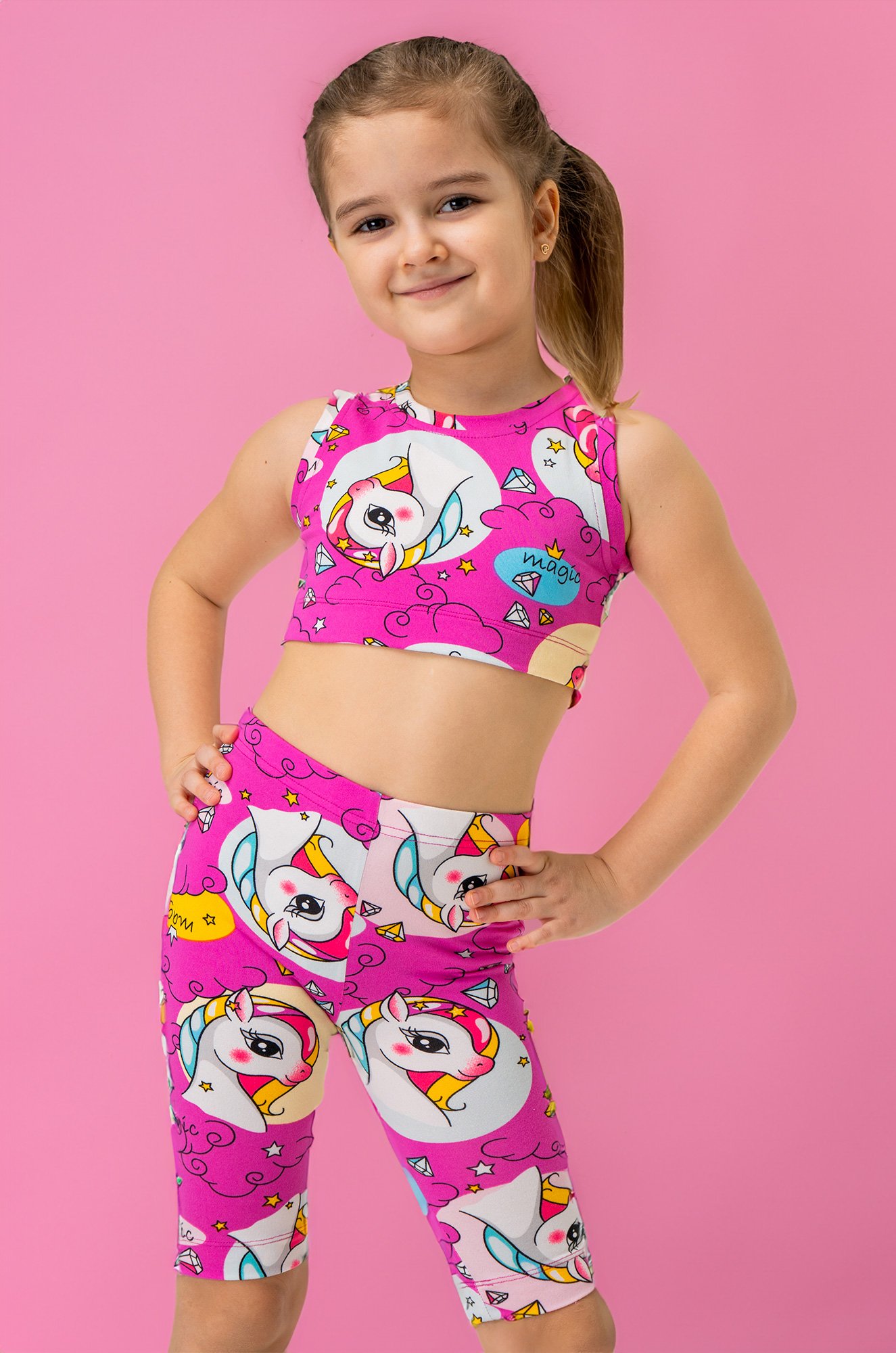 Хлопковый набор из велосипедок и топика подходит для танцев и тренировок по бегу и гимнастике. Облегающий костюмчик с принтом станет отличным решением для физкультуры и детского садика. Розовый комплект идеален для дома, отдыха и домашних дел.