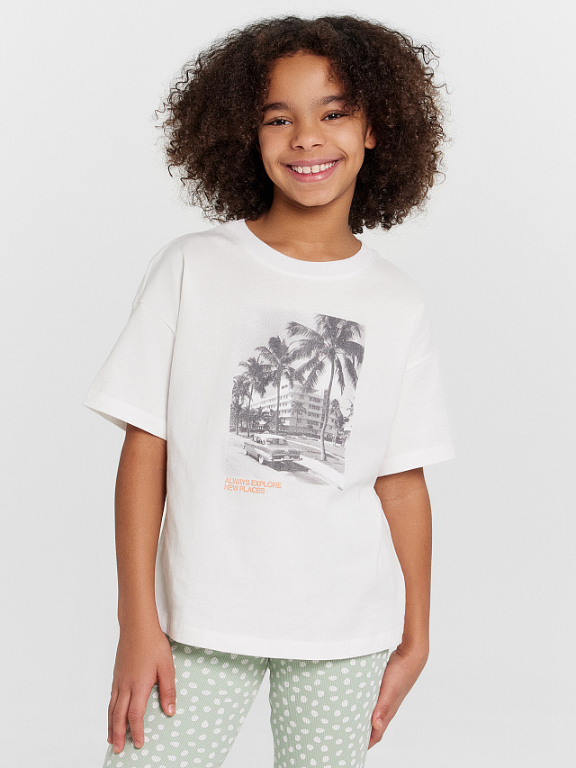Футболка из трикотажного полотна кулирного переплетения. Силуэт свободный, длина до середины бедра. Рукава короткие, горловина круглая. Дизайн футболки наверняка понравится вашей моднице!
