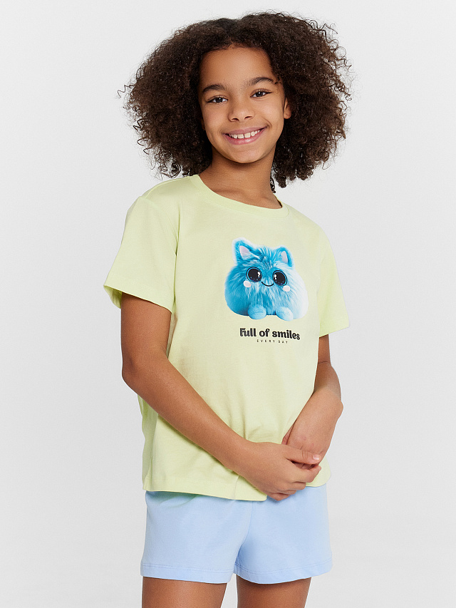 Модная футболка для девочек, выполненная из хлопковой трикотажной кулирки. Силуэт прямой. Перед и спинка без швов и рельефов. Рукава короткие, вырез классический – круглый, не глубокий. Стильная футболка с ярким дизайном!