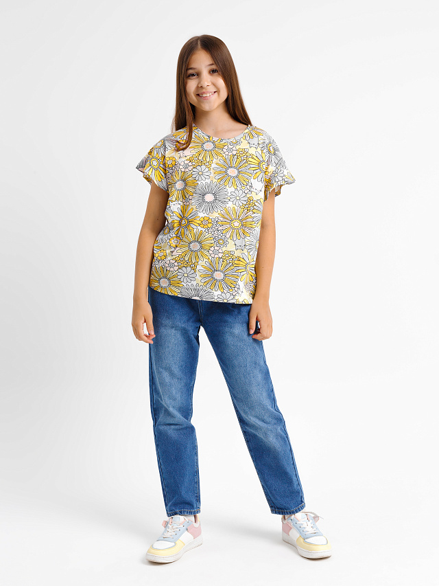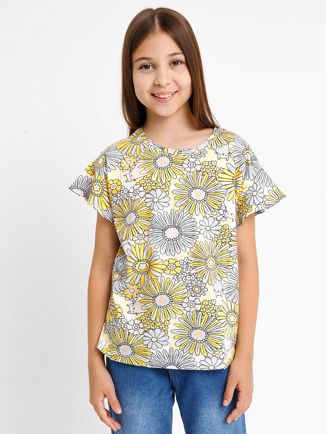 Необычная футболка для девочек, созданная из трикотажной кулирки. Силуэт прямой, длина до середины ягодиц. Горловина круглой формы. Спущенная линия плеча и углубленная пройма дарят особый комфорт, а короткие рукава в виде рюши делают футболку привлекательной.
