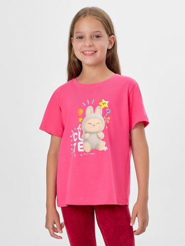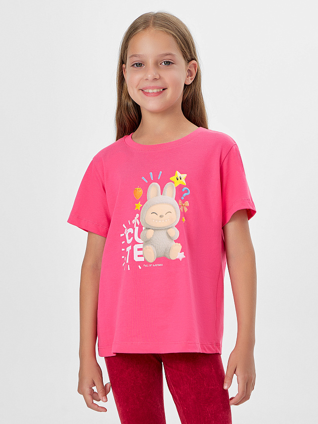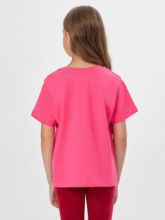 Яркий розовый цвет служит прекрасным фоном для нежного принта, делая футболку универсальной для сочетания с юбками, шортами и брюками.