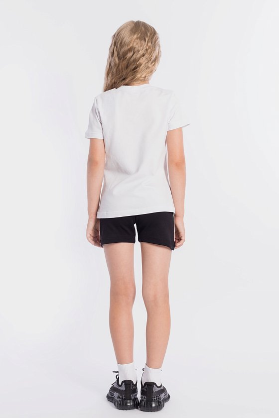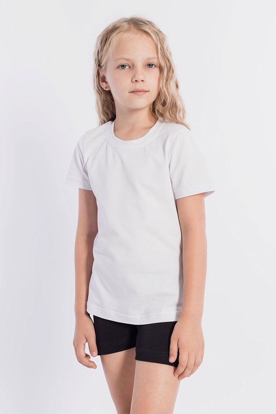 Футболка выполнена из хлопкового полотна, с коротким рукавом и круглым вырезом горловины.