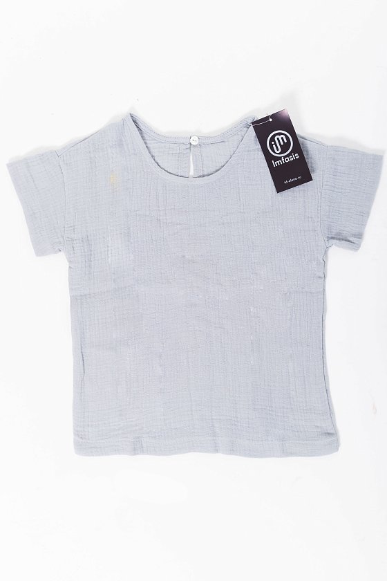 Футболка свободного силуэта из муслина. С коротким рукавом, линия плеча спущена. Вырез горловины обработан бейкой, сзади застёжка на одну пуговицу.