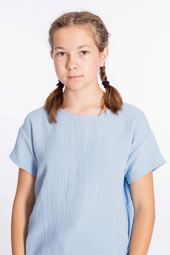 Футболка свободного силуэта из муслина. С коротким рукавом, линия плеча спущена. Вырез горловины обработан бейкой, сзади застёжка на одну пуговицу.