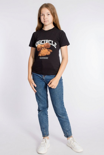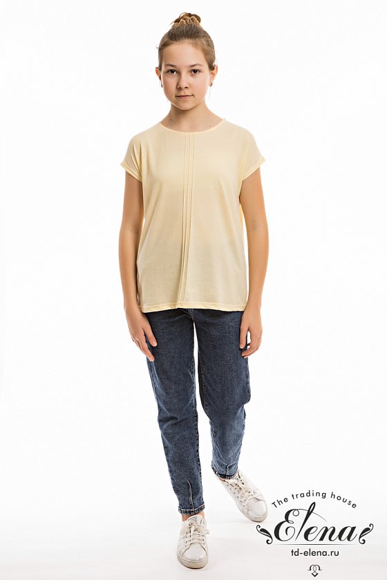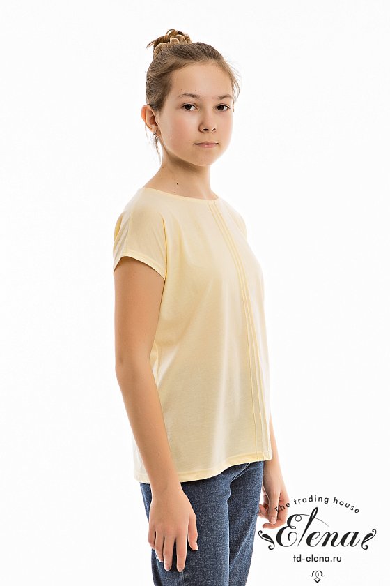 Футболка из однотонной кулирки, со спущенной линией плеча. Горловина с круглым вырезом, спереди по центру футболки три декоративных защипа.