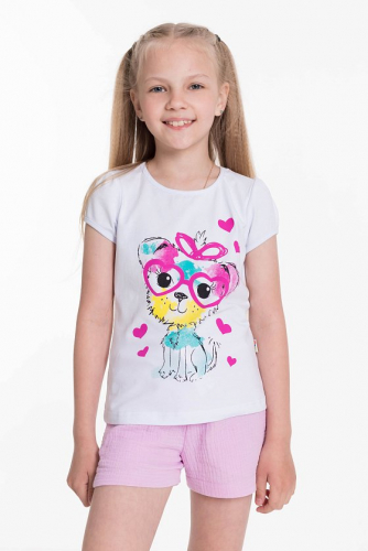 Футболка из однотонной кулирки, со спущенной линией плеча. Горловина с круглым вырезом, спереди по центру футболки три декоративных защипа.