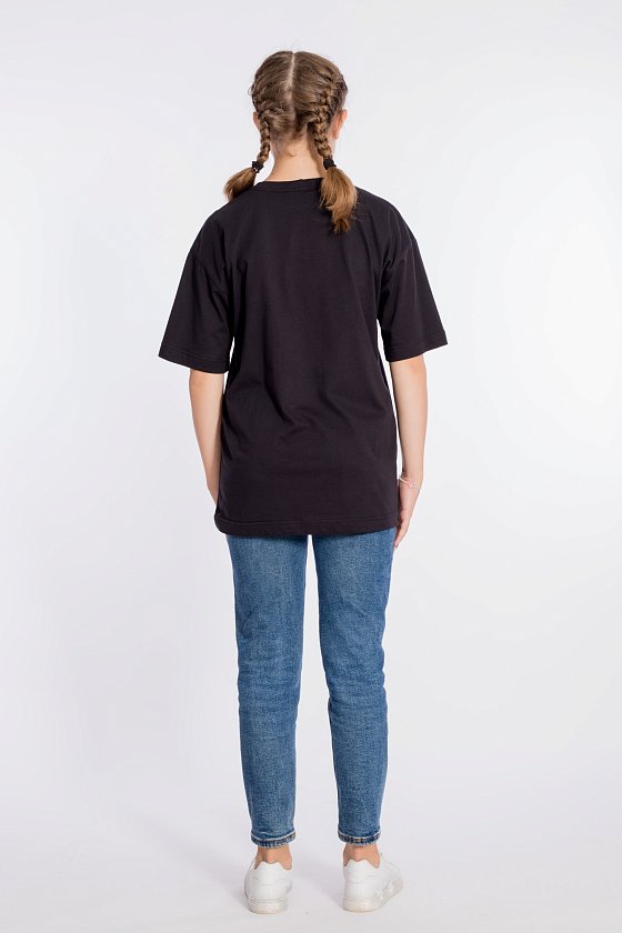 Футболка оверсайз из однотонной кулирки, 100% хлопок. С коротким рукавом и круглым вырезом горловины. Спереди нанесён принт.