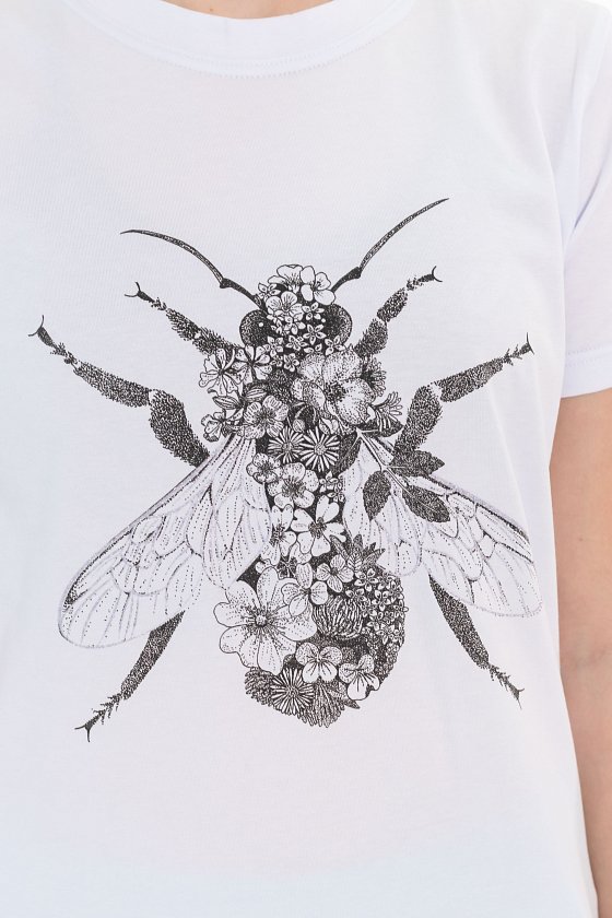 Футболка выполнена из х/б полотна с лайкрой, с коротким рукавом и круглым вырезом горловины. Спереди нанесён оригинальный принт.