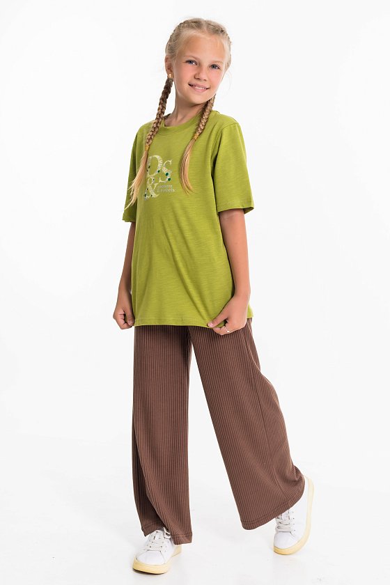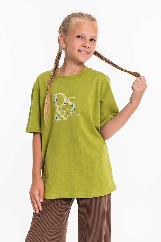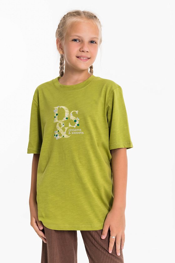 Детская футболка с принтом изготовлена из хлопкового полотна - кулирка "фламли", что обеспечивает комфорт и хорошую воздухопроницаемость. Футболка имеет короткий рукав и круглый вырез горловины, что придает ей классический стильный вид. Такая модель футболки отлично сочетается с джинсами, брюками или юбкой. Изготовленная из натуральной ткани, футболка обеспечит комфорт в течение всего дня.