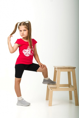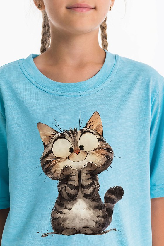 Детская футболка с принтом изготовлена из хлопкового полотна - кулирка "фламли", что обеспечивает комфорт и хорошую воздухопроницаемость. Футболка имеет короткий рукав и круглый вырез горловины, что придает ей классический стильный вид. Такая модель футболки отлично сочетается с джинсами, брюками или юбкой. Изготовленная из натуральной ткани, футболка обеспечит комфорт в течение всего дня.