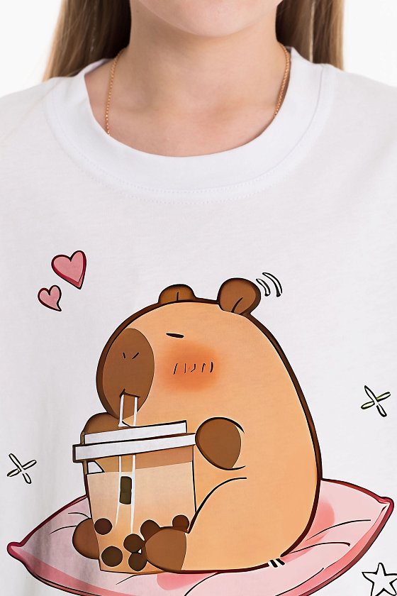 Футболка детская с коротким рукавом и округлым вырезом горловины, оформленным планкой. Спереди на футболке принт.