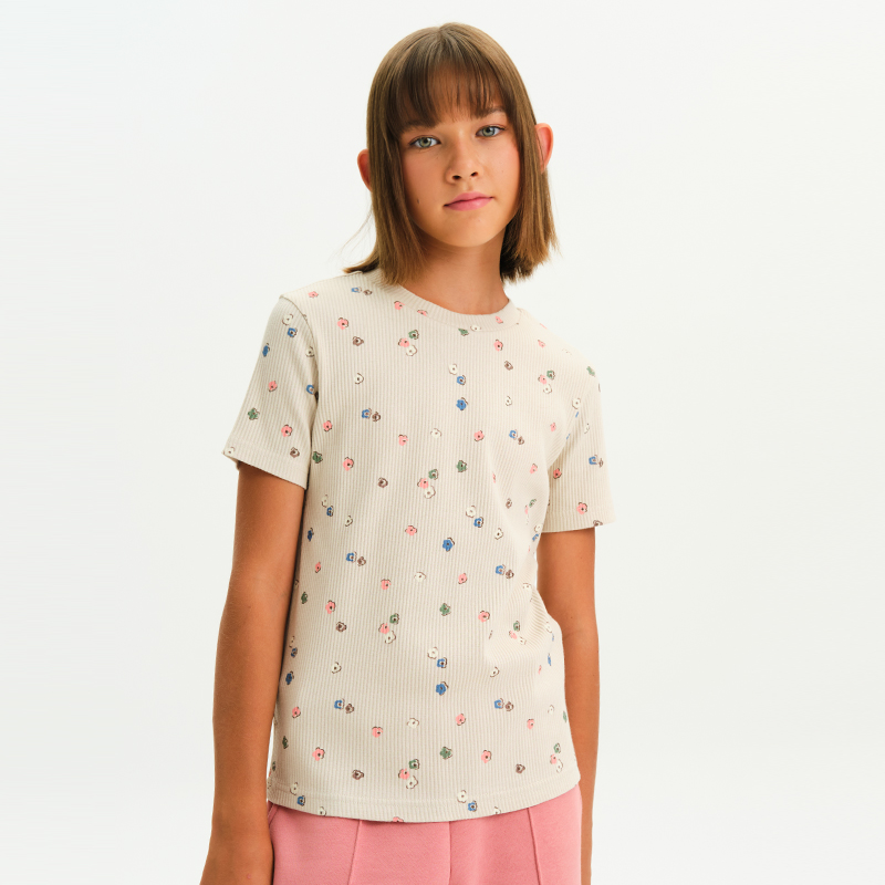 Состав: 50%хлопок 47%вискоза 3%эластанОписание: Очаровательная футболка для девочки из трикотажа кашкорсе — мягкая, эластичная и приятная к телу. Ткань в рубчик отлично тянется, сохраняет форму и обеспечивает комфорт на весь день. Модель умеренного объёма — не обтягивает, но и не смотрится слишком свободной. Легко комбинируется с юбками, шортами, сарафанами и джинсами. Декорирована нежным мелким принтом в виде цветочков, который делает образ особенно милым и романтичным. Идеально вписывается в актуальный "деревенский" (cottagecore) стиль — модное направление, вдохновлённое природой, простотой и уютом. Не забывайте о выборе правильного размера. Используйте таблицу размеров на фотографии, чтобы выбрать подходящий вариант. Обратите внимание, что цвет товара на экране вашего устройства может отличаться от реального.