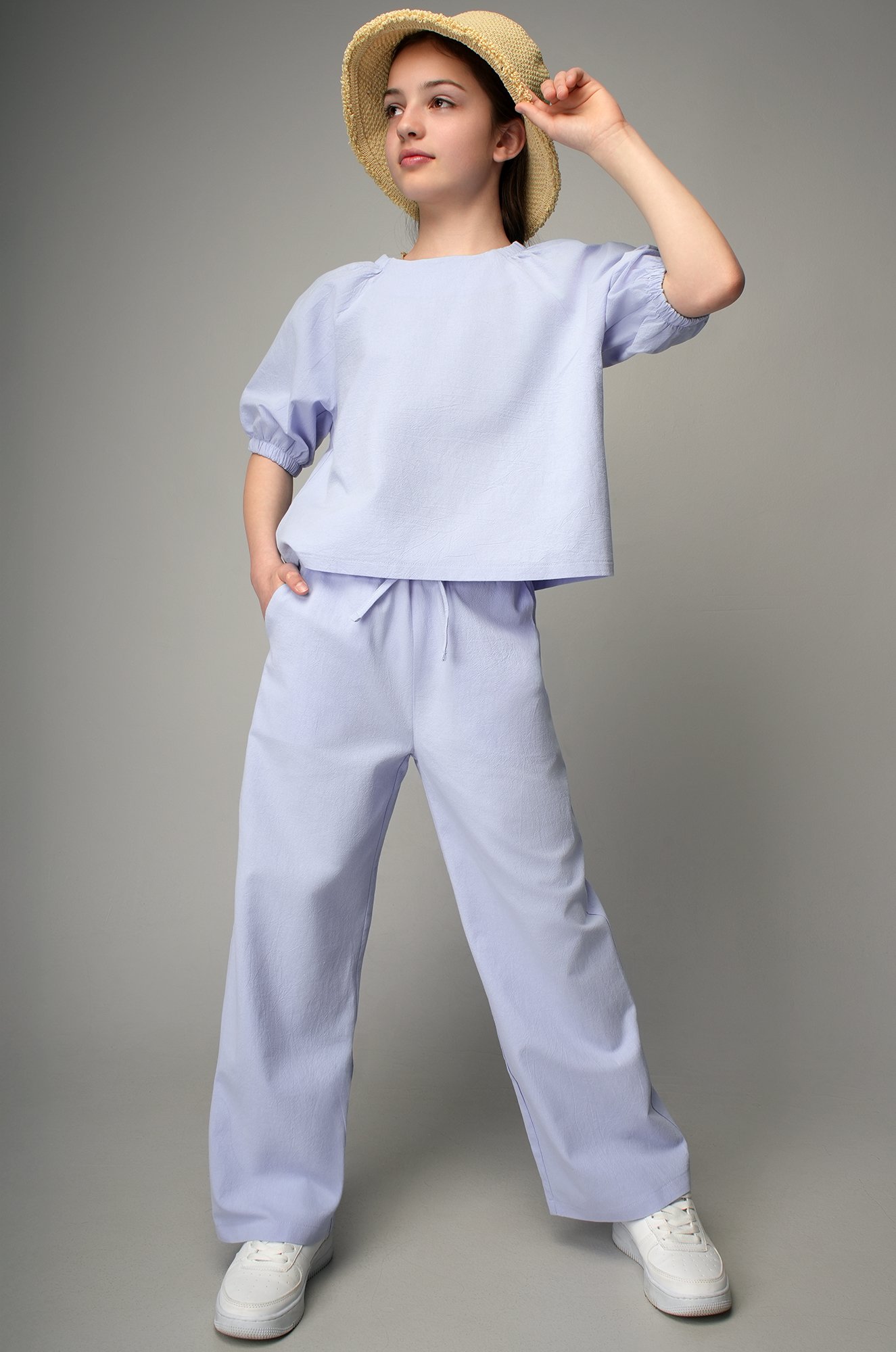 Такой воздушный и красивый — хлопковый костюмчик для девочки создан для приятного отдыха! Брючный костюм двойка выглядит нарядно и стильно, а нежный голубой цвет делает его универсальным для любого случая.