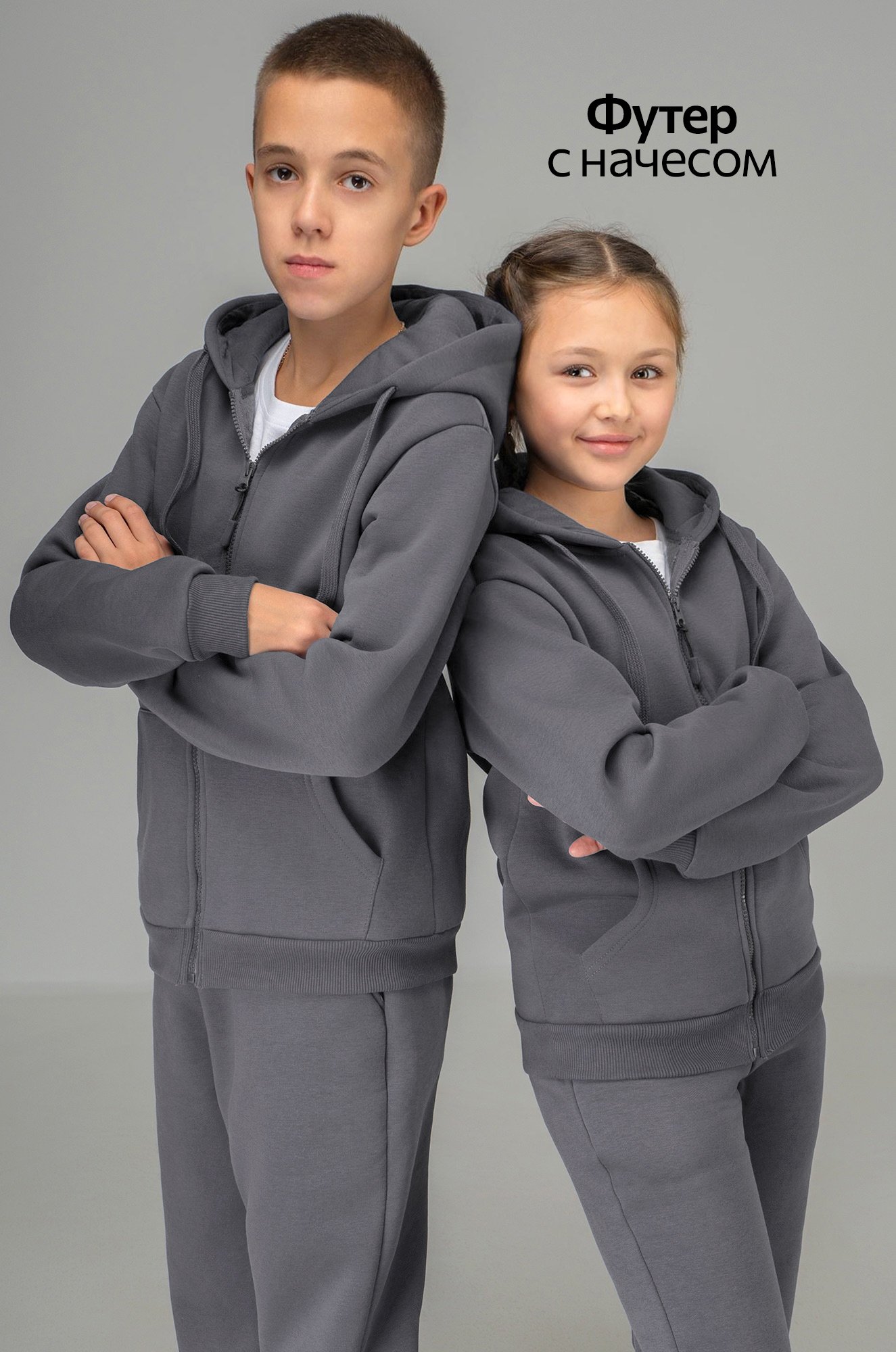Детский костюм с худи и брюками для мальчиков и девочек выполнен из плотного трикотажа футер с начесом. Базовый темно-серый цвет делает комплект для подростков универсальным и легко вписывается в повседневные образы.
