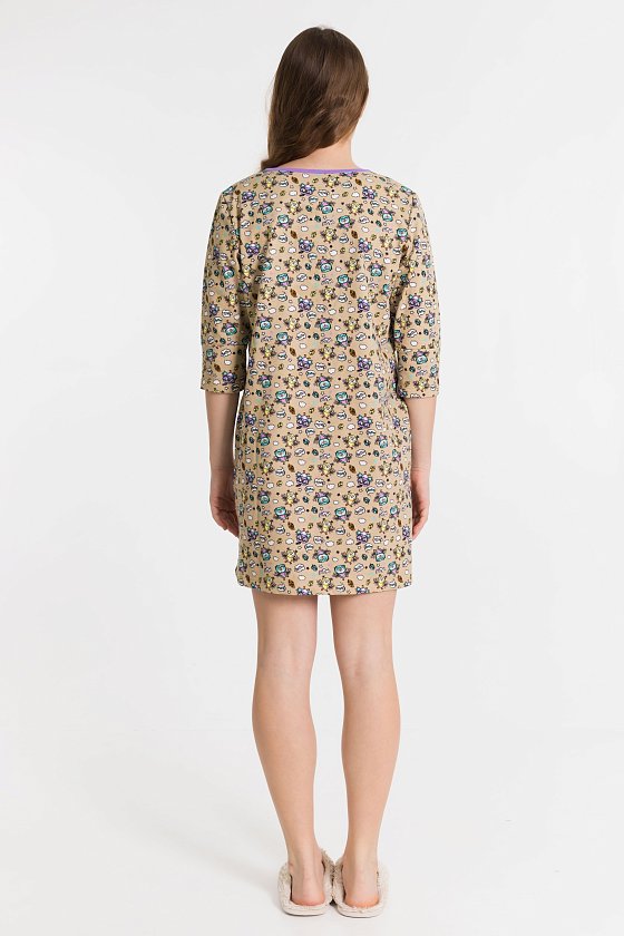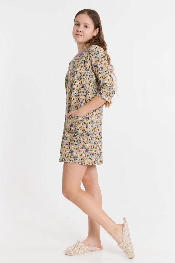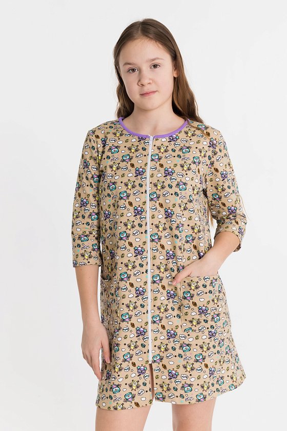 Халат выполнен из футера двухнитки (начёс). Халат застёгивается на молнию, рукава длиной 3/4, спереди расположены два накладных кармана.