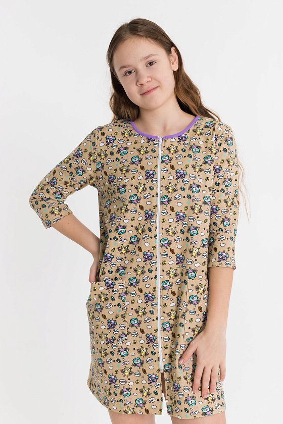 Халат выполнен из футера двухнитки (начёс). Халат застёгивается на молнию, рукава длиной 3/4, спереди расположены два накладных кармана.