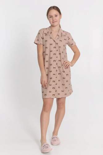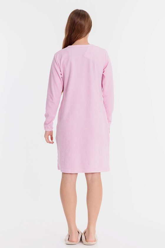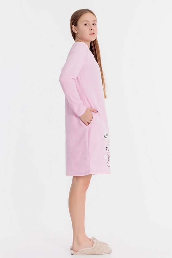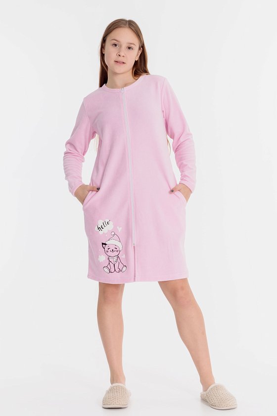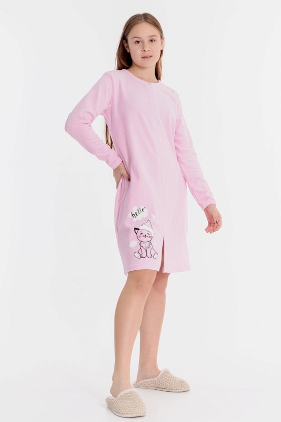 Халат с длинными рукавами выполнен из велюра. Центральная застёжка на молнию, по бокам расположены два кармана. Спереди на халате нанесён принт.