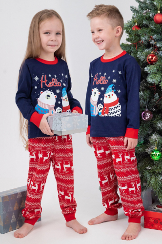 Детская новогодняя пижама с брюками выполнена из натурального 100% хлопка. Свободный крой не сковывает движений и позволяет ребенку всегда оставаться активным, а праздничный принт Олени и надписи создают уютную атмосферу и поднимают настроение. Трикотажная пижамка для мальчиков и девочек станет отличным подарком на Новый год и Рождество.