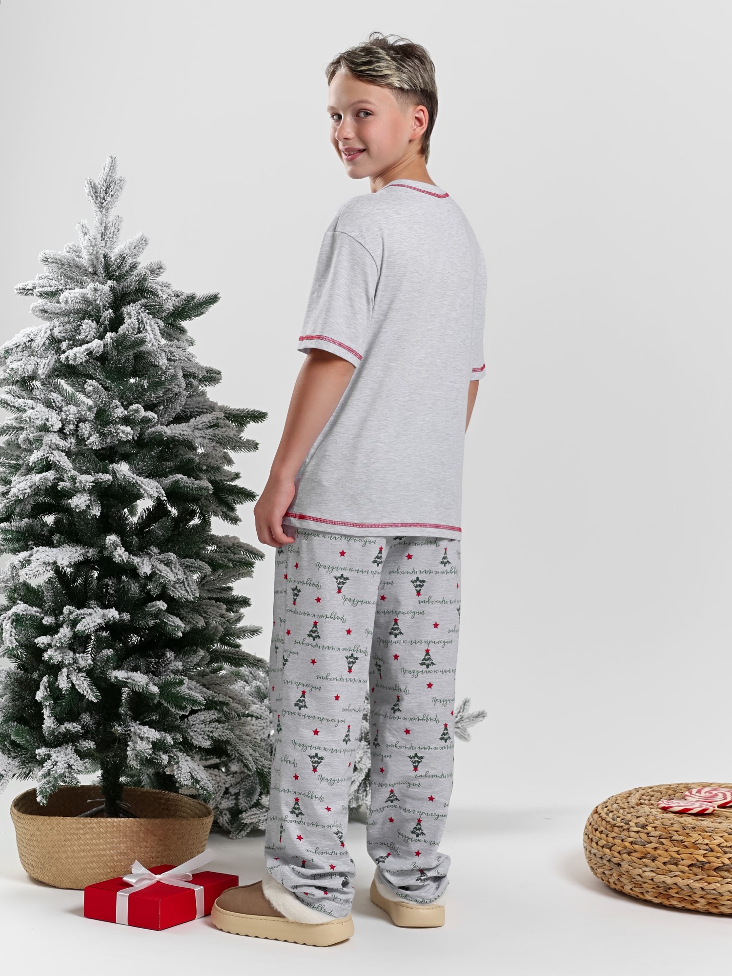 Костюм для мальчика из трикотажного полотна в комбинации двух видов: полотна "кулирка-кармеланж" и полотна "кулирка" с набивным тематическим рисунком на сером фоне , состоящий из футболки и брюк. Футболка - классического силуэта, свободного покроя, с приспущенным плечом, с втачными рукавами длиной до локтя, горловиной овальной формы, обработанной втачной планкой и принтом в центре переда. По шву втачивани я планки настрочена декоративная (5-ниточная) отделочная строчка нитками контрастного цвета Подгибка низа рукавов и изделия так же выполнена с применением декоративной отделочной строчки. Брюки выполнены из полотна с набивным темкатическим рисунком, длинные, умеренной ширины, прямые, с эластичной тесьмой по талии.
