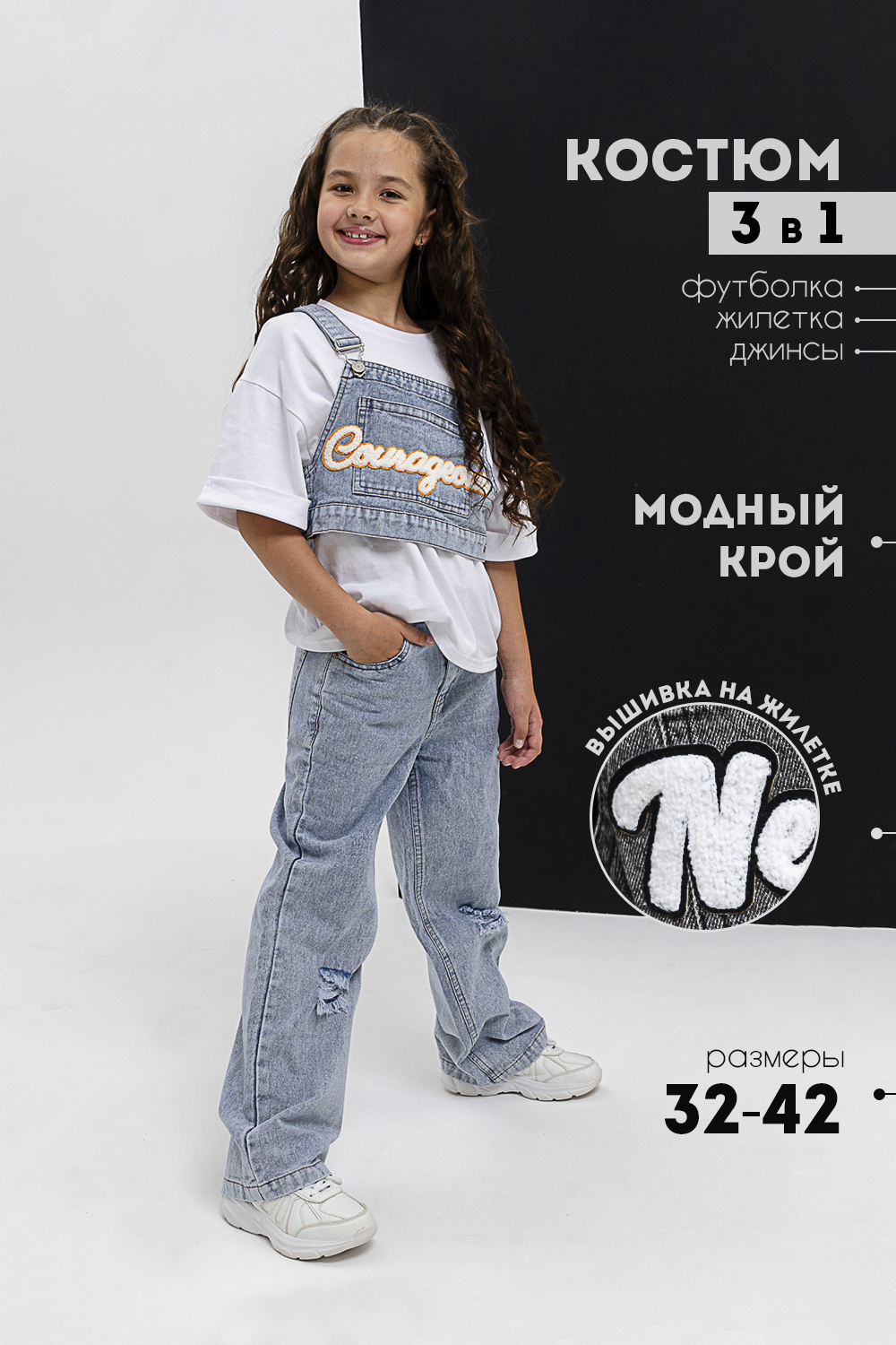 Костюм тройка для девочки. Футболка оверсайз из 100% хлопка. Жилетка и джинсы из плотной ткани джинс. На жилетке вышивка.