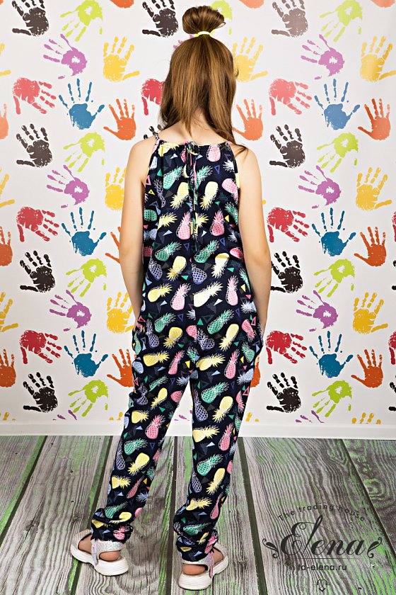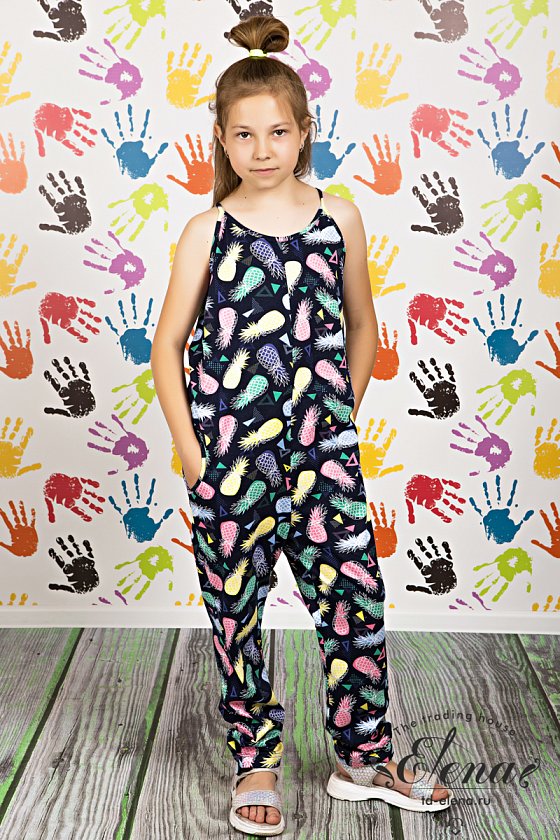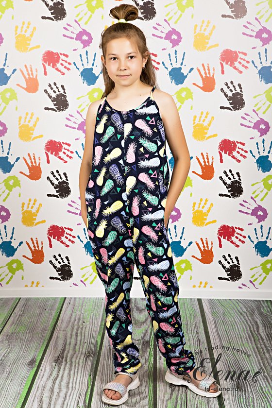 Комбинезон для девочки выполнен из х/б полотна. В боковых швах расположены карманы. Бретельки регулируются сзади, в кулиске спинки.