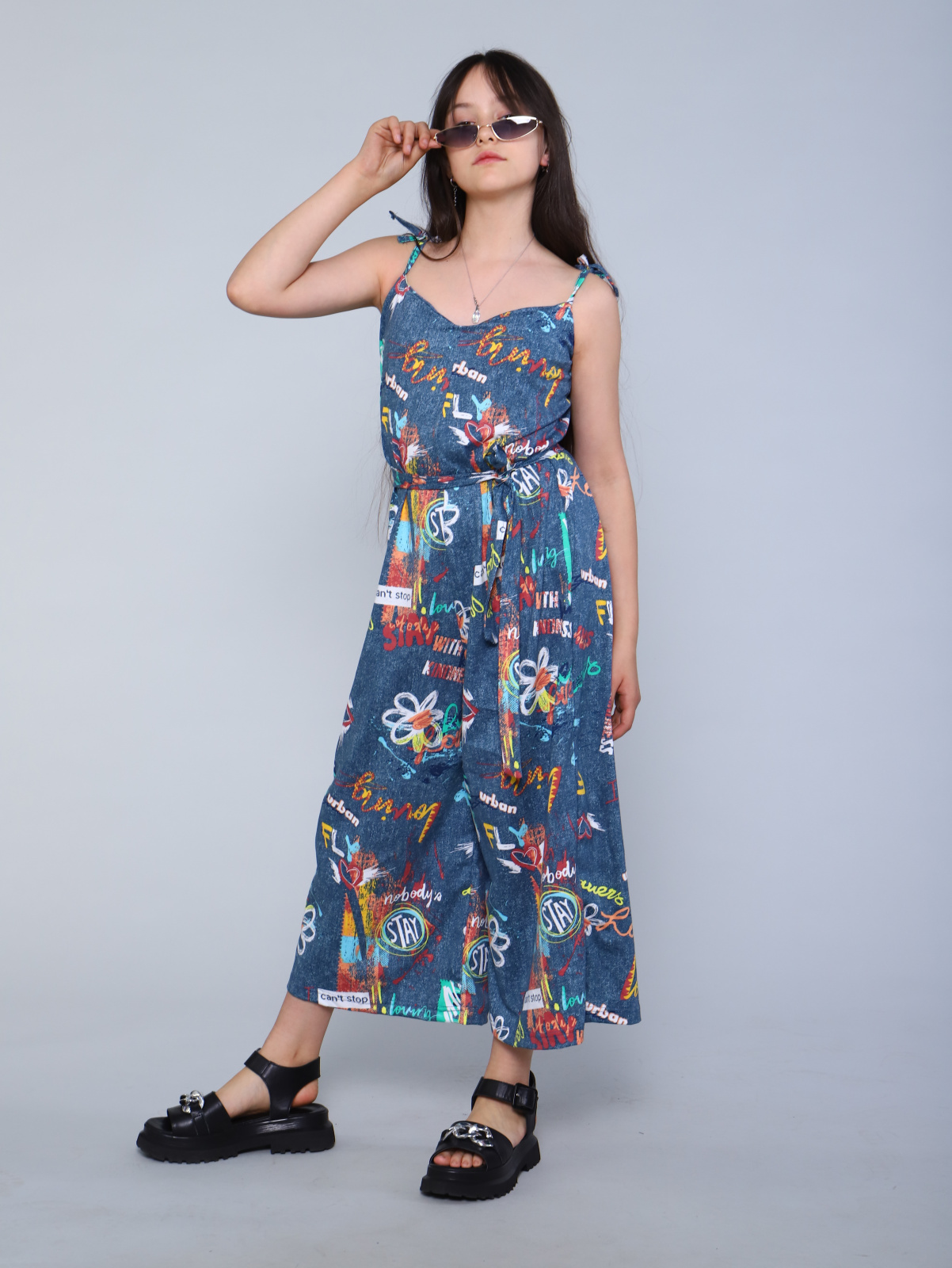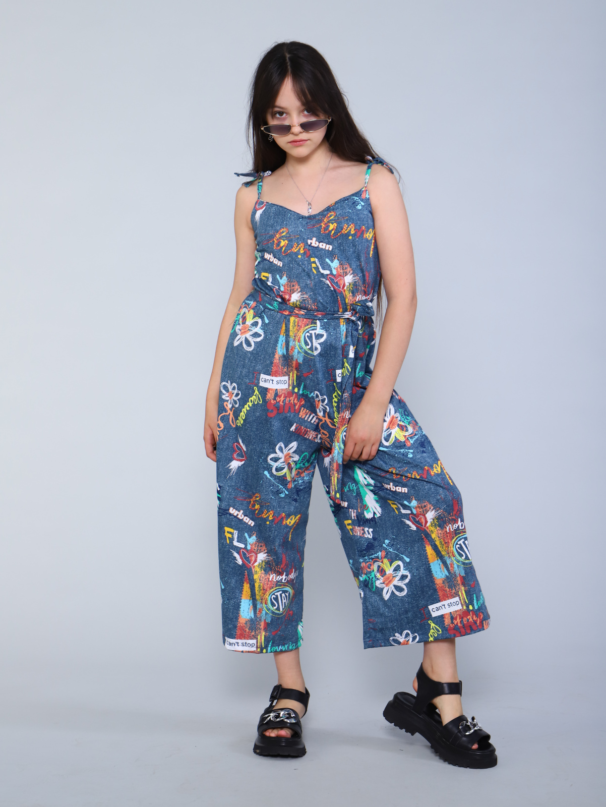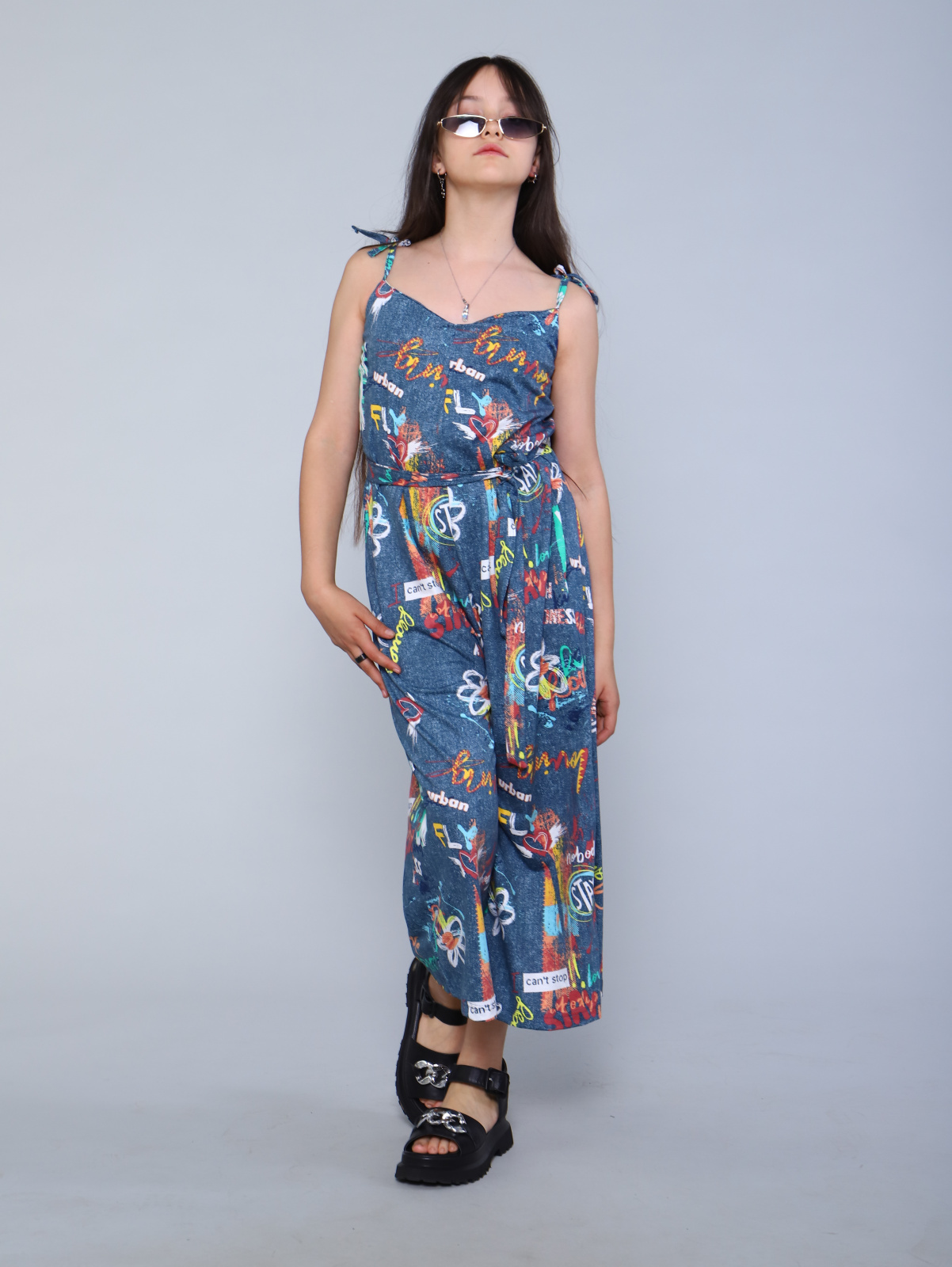 Модель свободного силуэта, представляет собой сочетание топа на бретельках и брюк свободного силуэта. Бретели разрезные, что позволяет регулировать глубину проймы, дает возможность подстроиться под любые типы фигур.