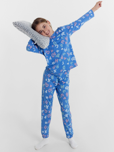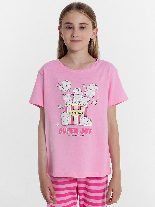 Уютная и красивая пижама для девочек. Выполнена из хлопковой трикотажной кулирки. В комплект входят футболка и брюки. Футболка с круглым вырезом, короткими рукавами. Свободный силуэт и классическая длина обеспечивают комфорт. Брюки длинные, слегка заужены к низу, с тесьмой в поясе. Комфортно и очень красиво!