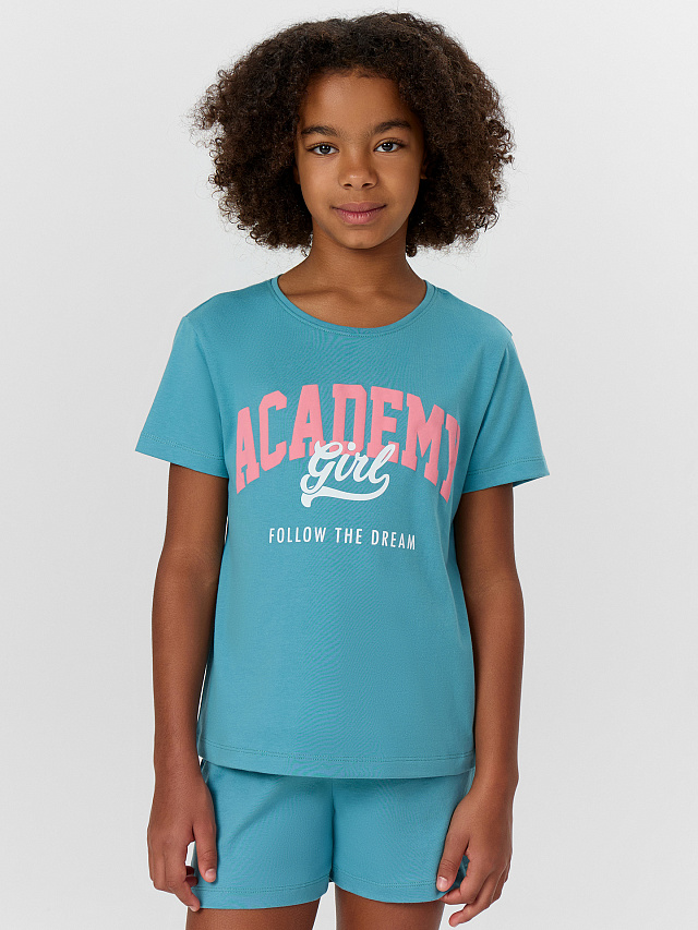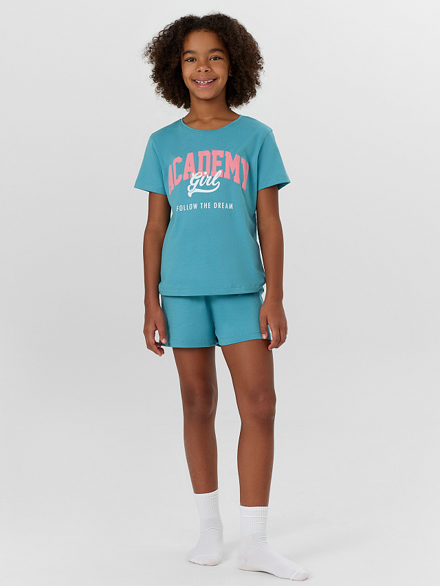 Комплект для девочки, состоит из футболки с короткими рукавами и шорт из натурального хлопка. Подходит для сна и отдыха. Материал очень приятный к телу, хорошо пропускает воздух, что позволяет чувствовать себя комфортно даже в жаркую погоду. Идеальный выбор детской одежды для дома. Стильно, красиво, комфортно. Футболка декорирована интересным принтом, шортики однотонные. Широкий размерный ряд, базовые и яркие расцветки, модели с принтами, рисунками и печатями. Купите детскую пижаму для девочки от Mark Formelle, порадуйте ребенка красивым и стильным подарком!