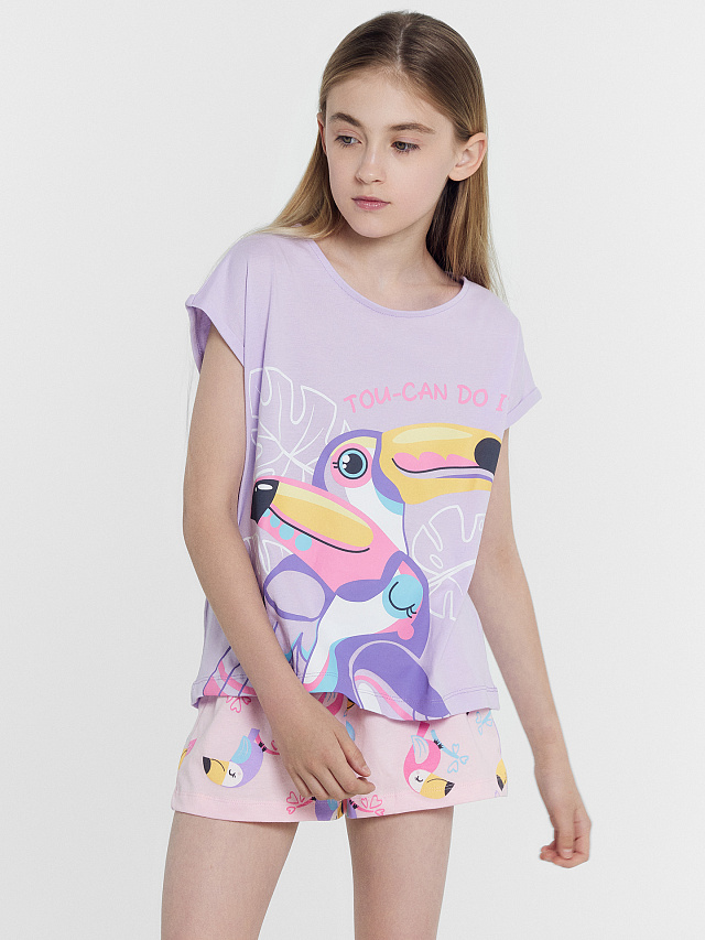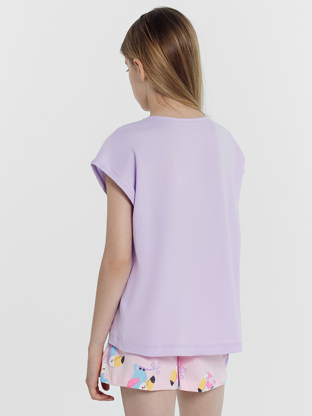 Комплект для девочек (футболка, шорты) лилово-розовый с птичками