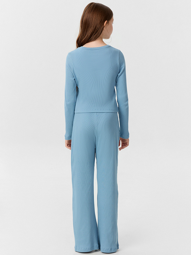 Лонгслив укороченный. Горловина круглой формы с притачной обтачкой из основного полотна. Рукава длинные втачные. Перед и спинка цельнокроеные. Низ лонгслива, рукавов и брюк обработан на 2-х игольной плоскошовной машине швом в подгибку. Брюки длинные, прямые, свободные. Пояс цельнокроенный с эластичной тесьмой внутри (внутренняя резина 35RV) ширина 35мм.