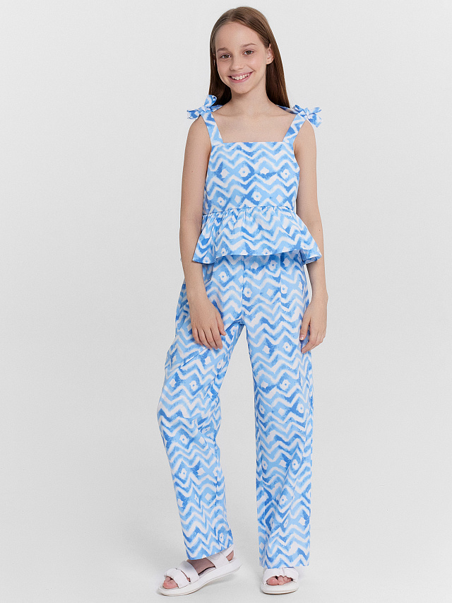 Этот элегантный комплект для девочек — нежное и комфортное сочетание утонченного дизайна и удобного кроя, созданное для стильных образов. Топ на бретелях полуприлегающего силуэта подчеркивает легкость и женственность, а завязки на бантики добавляют игривый акцент, делая модель особенной. Благодаря свободному крою, топ не сковывает движений, обеспечивая комфорт в течение всего дня. Брюки прямого кроя с посадкой на талии создают гармоничный силуэт, а эластичный пояс мягко прилегает к телу, не вызывая дискомфорт. Низ изделия застрочен швом в подгибку, что делает модель аккуратной и износостойкой. Комплект выполнен из натурального хлопка, который обеспечивает воздухопроницаемость и приятные ощущения на коже, делая его идеальным для теплого сезона. Практичный и стильный, этот комплект легко сочетается с разными аксессуарами, позволяя создавать нежные и элегантные образы!