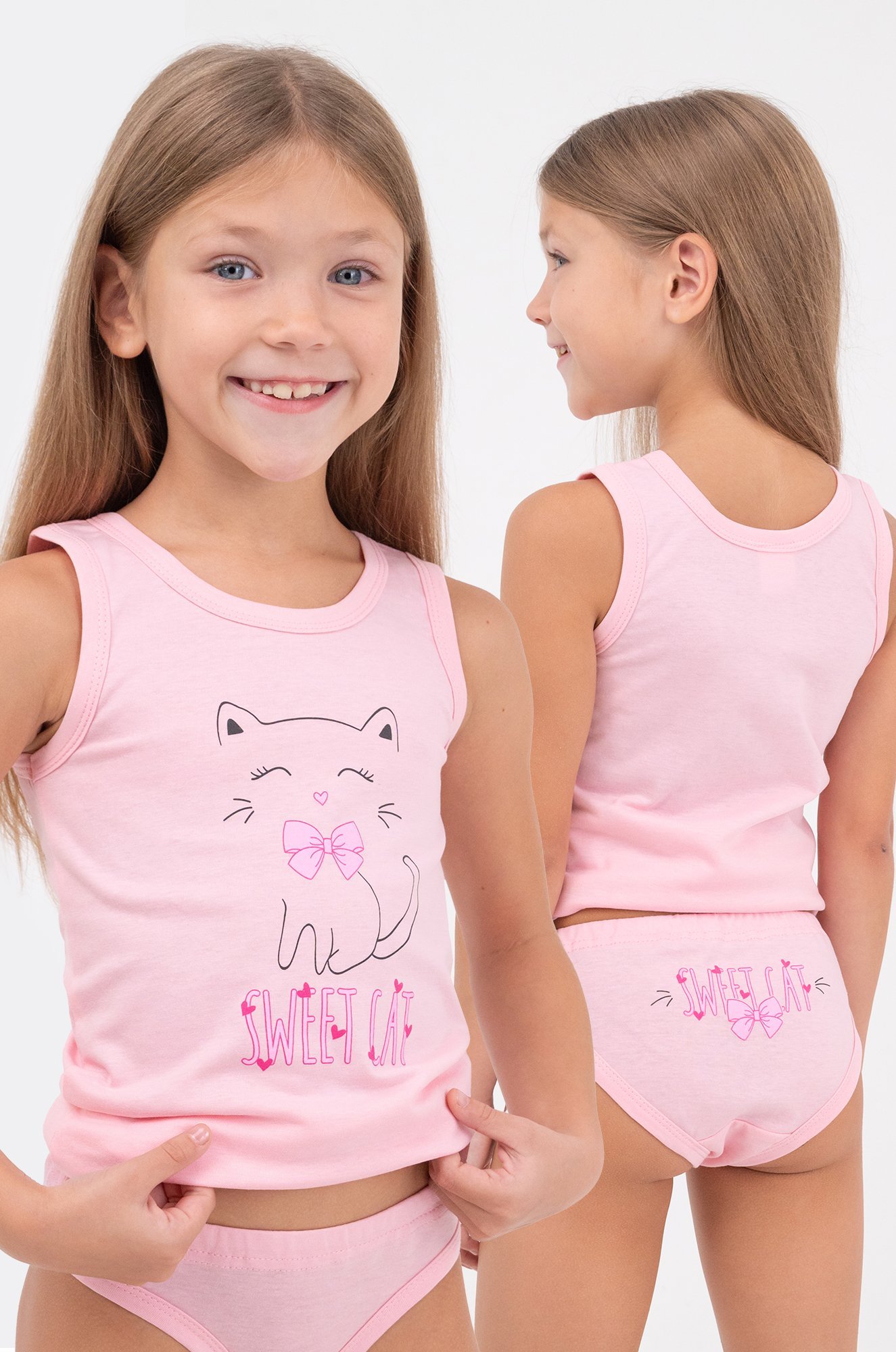Мягкость, легкость и комфорт! Детский набор из майки и трусов слипов для девочки выполнен из натурального 100% хлопка. Розовый комплект для детей станет любимым в гардеробе благодаря милому принту Котик.