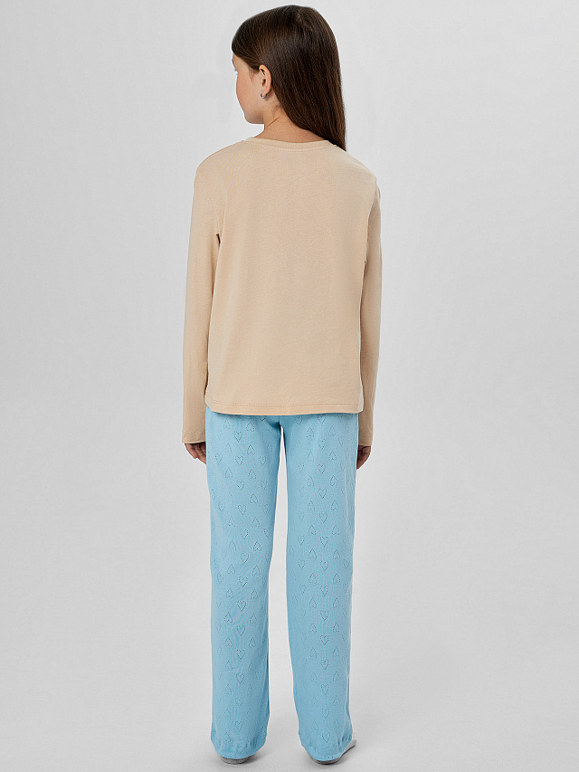Лонгслив с круглой горловиной и длинными рукавами обеспечивает удобство и свободу движений во время сна или игр перед сном. Брюки прямого кроя на мягком широком поясе с эластичной резинкой не давят на талию и надежно фиксируются, не сползая при активном движении. Оба предмета изготовлены из эластичной рибаны, которая хорошо тянется, сохраняет форму после множества стирок и позволяет коже дышать.