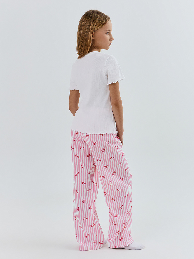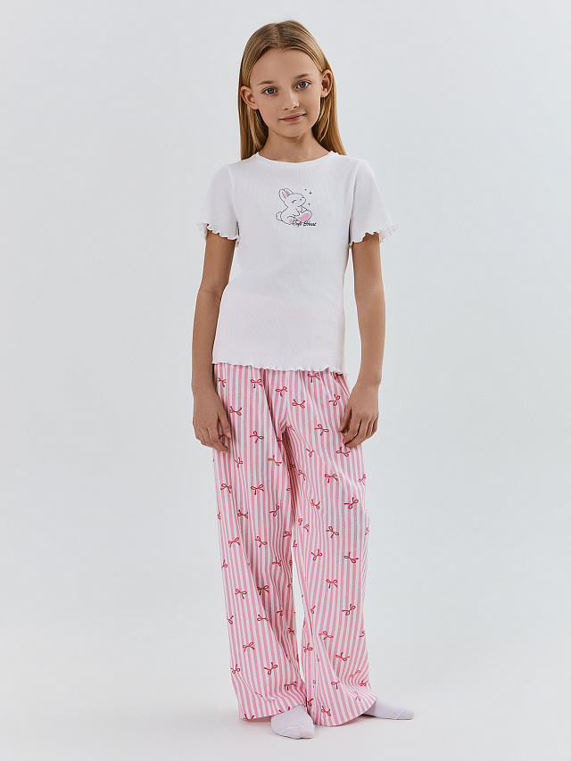 Домашняя пижама для девочек с нежным узором из бантиков и надписью «Мягкое сердце» — уютный комплект для спокойных дней и тёплых вечеров. В него входят полуприлегающая футболка с коротким рукавом и прямые свободные брюки. В таком комплекте удобно играть, отдыхать и заниматься своими делами.
