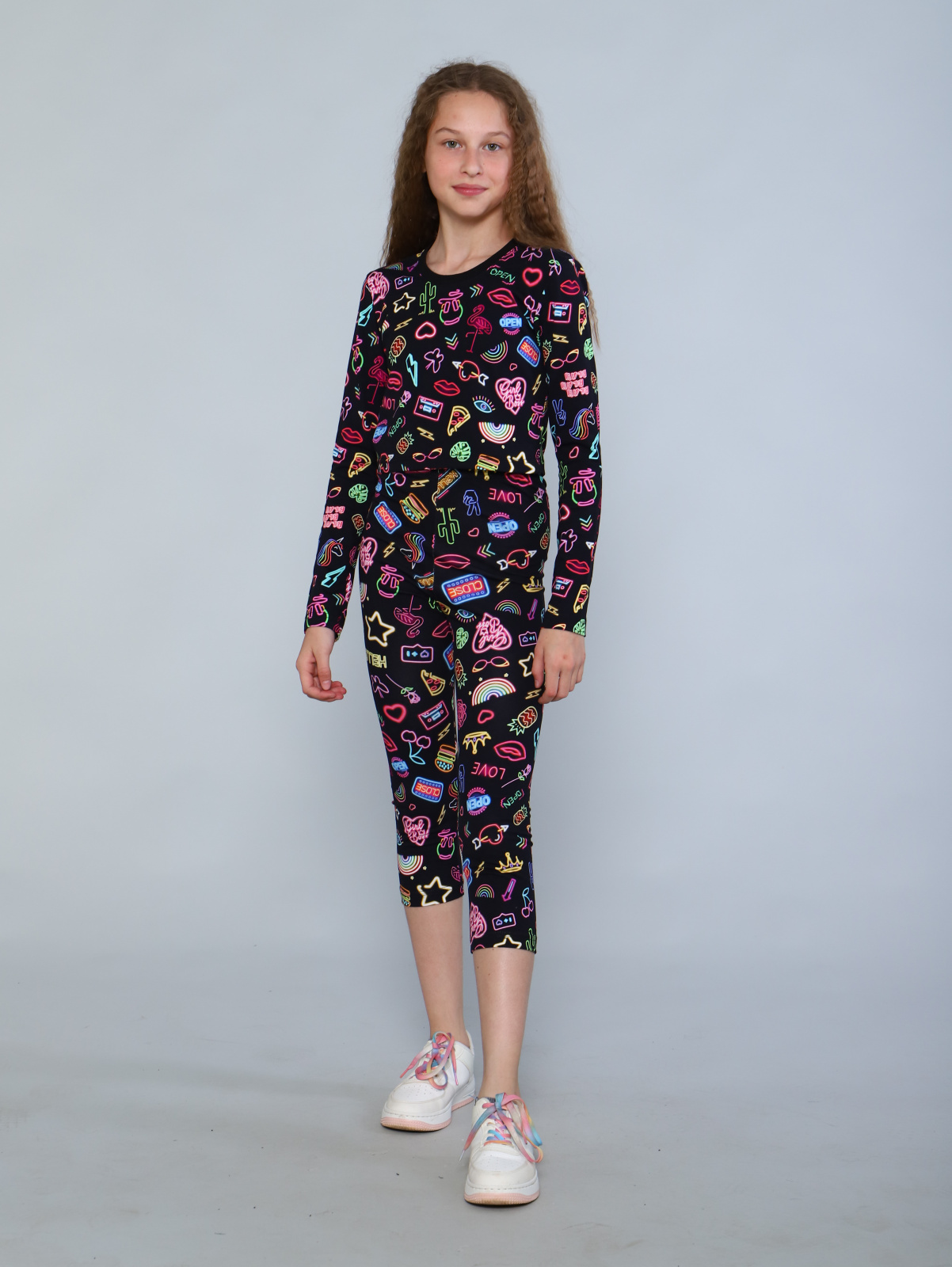 Комплект состоит из футболки с длинными рукавами и удлиненными велосипедками. Укороченные лосины с завышенной талией и эластичным поясом на резинке для удобства, не сползают, хорошо облегают фигуру.