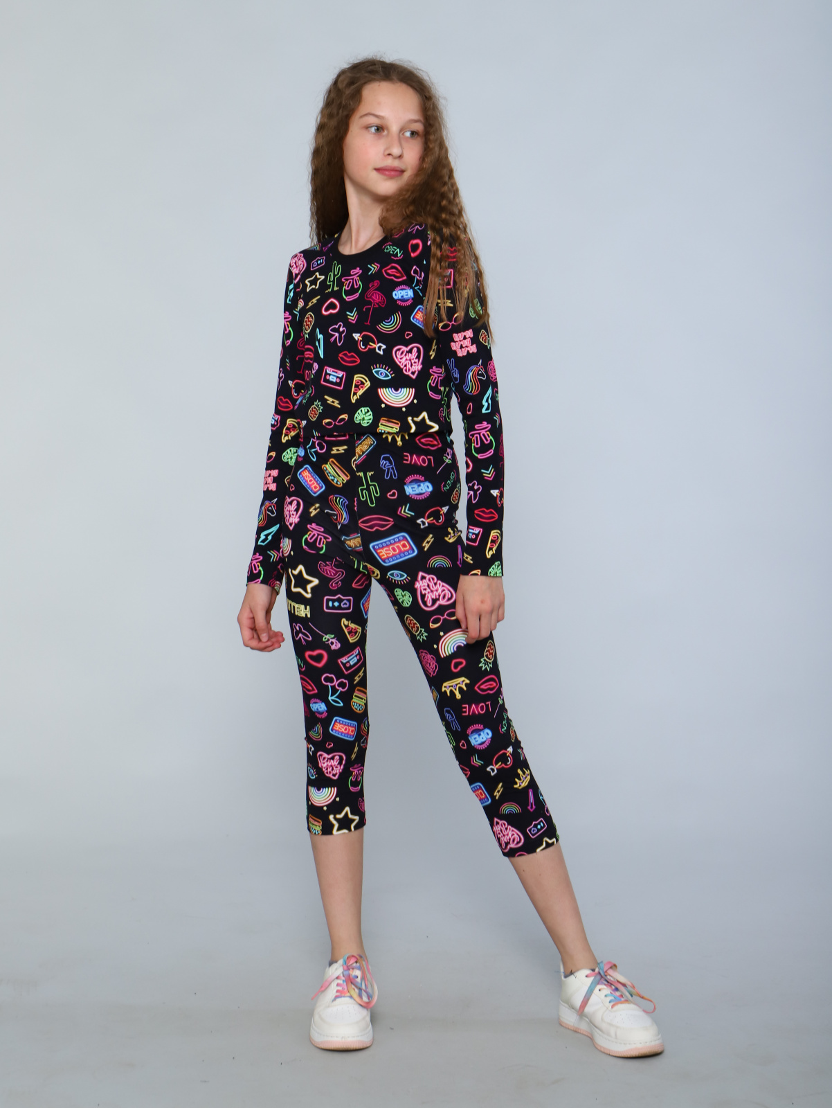 Комплект состоит из футболки с длинными рукавами и удлиненными велосипедками. Укороченные лосины с завышенной талией и эластичным поясом на резинке для удобства, не сползают, хорошо облегают фигуру.